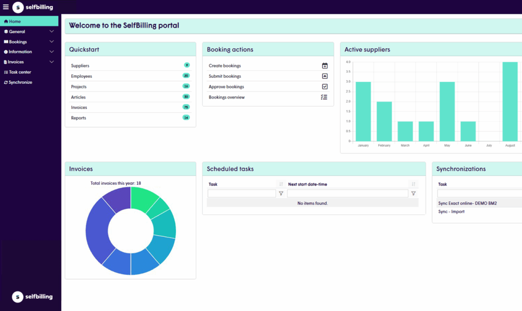 Selfbilling is a software module that automatically generates accurate invoices on behalf of suppliers, freelancers, and volunteers. The control point is moved forward. First, hours and costs are checked and approved, then the system automatically generates the correct invoices on behalf of the supplier or freelancer. All invoices are processed directly in ERP, accounting, or HR systems, eliminating the need for manual checks and corrections.